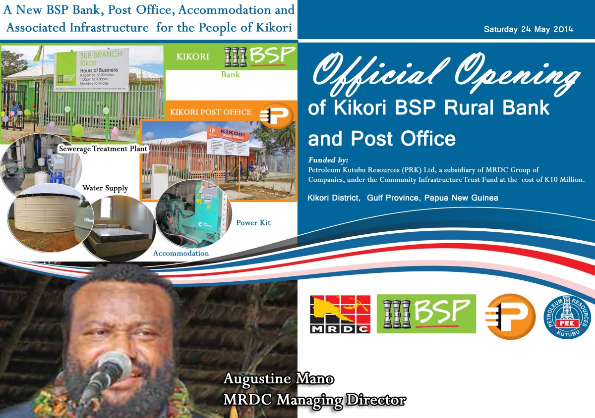 It is indeed my honour to witness the official opening of the new BSP Bank and Post Office in Kikori initiated, developed and delivered in a partnership between MRDC, its subsidiary landowner company Petroleum Resources Kutubu (PRK), Bank South Pacific (BSP) and Post PNG.