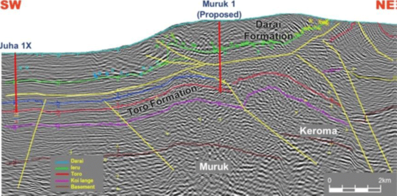 PNG received its 2017 New Year’s blessing with the breaking news of Muruk 1 discovery at the eve of the year end. Oil Search began drilling the Muruk-1 well on Nov. 2, 2016. The drilling campaign concluded with a successful discovery in the Toro formation of the early cretaceous stones similar to the Hides and Juha gas fields. See figure below for the licence area showing well location and see figure 2 for cross-section map of the Muruk 1 prospect showing the Toro formation of the drilling and appraisal target.
